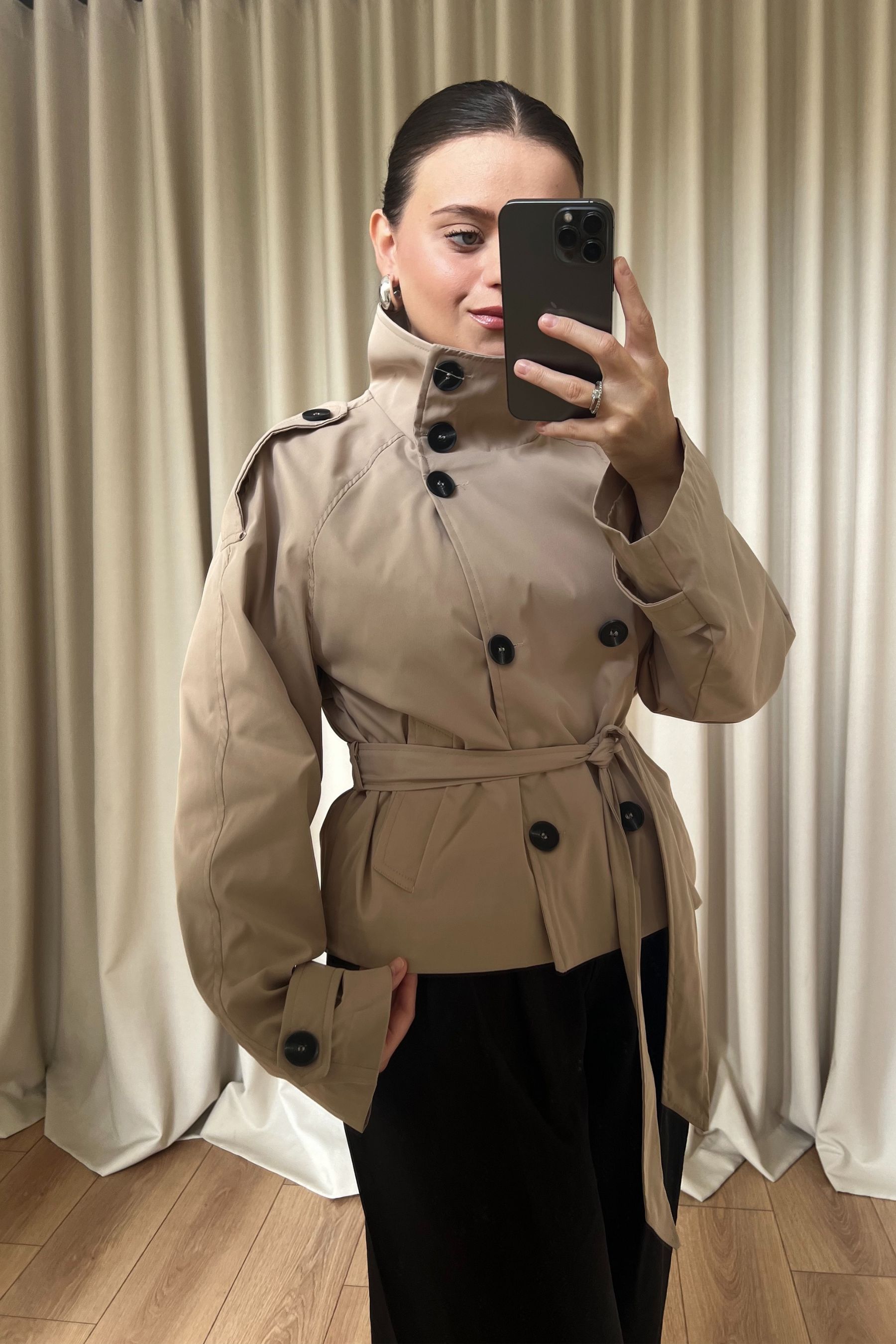 Vizon Dik Yaka Kuşaklı Kısa Trençkot